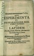 Der zweyte neuausgegangene Tractat, genannt Experimenta de Praeparatione Mercurii Sophici ad Lapidem, Per Regulum Matum Stellatum q.etc. Lunam, Das ist: Erfahrungs-Proben von der Bereitung des Philosophischen Mercurii zum Stein/ Vermittelst des Martialischen / Antimonialischen gestirnten Kegels und der Lunae. [Fragment aus: Magnalia Medico-Chymica Continuata, Oder/ Fortsetzung der hohen Artzney- und Feuerkunstigen Geheimnüssen...]. [Nürnberg, Endter, 1680]. Pag. [S. 331-378]. Priv. Brosch. späterer Zeit., Abbildung Fragment aus VD17 39:124923T. Ferguson I, 144. - Einige hds. Nr. im Text, fleckig, Gbrsp. - Eine Übersetzung aus dem 1668 in Amsterdam erschienenen "Tres Tractatus de Metallorum Transmutatione" (laut kvk).