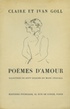 Poèmes d'Amour. Illustrés de sept dessins de Marc Chagall. Paris, Éditions Fourcade, (1930). 110 S. OBrosch. m. illustr. OSch., Abbildung EA. In franz. Sprache. Nr. 256 von 865 num. Expl. Mit den sieben Tafeln. - Etw. angestaubt, geringfügig fleckig, leichte Gbrsp. - Goll (Yvan, auch Iwan oder Ivan Goll, d.i. Isaac Lang) (1891- 1950), studierte an der Universität Straßburg zunächst Rechtswissenschaften und promovierte 1912 zum Doktor der Philosophie. Als Pazifist vor dem Wehrdienst fliehend, emigriete er zu Beginn des ersten Weltkrieges 1914 in die Schweiz, wo er in Zürich, Lausanne und Ascona lebte. Nach Kriegsende zog es Goll in die französische Hauptstadt Paris. Hier heiratete er die Journalistin Clara (Claire) Aischmann. Mit seiner Frau floh Goll 1939 am Anfang des Zweiten Weltkriegs ins New Yorker Exil. 1947 kehrten sie nach Frankreich zurück. Dort starb er in Neuilly-sur-Seine, einem Vorort von Paris, im Alter von 58 Jahren. Goll bewegte sich sein Leben lang zwischen mehreren Identitäten: Seine Zugehörigkeit erläuterte er selbst so: Durch Schicksal Jude, durch Zufall in Frankreich geboren, durch ein Stempelpapier als Deutscher bezeichnet. Als Lyriker ging Yvan Goll vom deutschen Expressionismus aus. Ab 1919 war er einer der Wortführer des französischen Surrealismus. 1920 erschien in der Anthologie "Menschheitsdämmerung" die Vers- und die Prosafassung seiner Dichtung Panamakanal. 1924 kam das von ihm 1919 verfasste satirische Drama "Methusalem oder Der ewige Bürger" in Berlin zur Uraufführung. Eines seiner Hauptwerke ist der Gedichtzyklus "Johann Ohneland" (Originaltitel "Jean sans terre"), der postum 1957 veröffentlicht wurde. Trotz seiner Bedeutung für Expressionismus und Surrealismus und seines dreisprachigen Schreibens in englischer, französischer und deutscher Sprache blieben Golls Werke in Deutschland recht unbekannt. (Zitat)