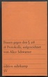Frauen gegen den § 218. 18 Protokolle, aufgezeichnet von Alice Schwarzer. Mit einem Bericht der Sozialistischen Arbeitsgruppe zur Befreiung der Frau, München, und einem Nachwort von Alice Schwarzer. (= edition suhrkamp Nr. 546.) Frankfurt, Suhrkamp, 1972. 155 Seiten, 18 x 11 cm, Broschur. |