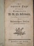 Die letztern Tage der jüngeren Demoiselle M. M. Ch. Ackermann. Aus authentischen Quellen zum Druck befördert. Mit Vorbericht [des anonymen Herausgebers. Briefroman]. Frankfurt und Leipzig: 1789. 17 x 10,5 cm. Farbschöner, flexibler, pergamentähnlicher Papp - Band auf 5 Bünden. Die Ecken abgerundet. 3 Blatt, 106 Seiten. Der Buchblock altersbedingt gebräunt und, vom Kopfschnitt ausgehend, feuchtigkeitsfleckig. Seite 3 / 4 tintenfleckig. Kleine Stempel (siehe Abbildungen) auf dem zweiten Blatt sowie Seite 1, dort auch ein kleiner Vermerk in Tinte. Ganz gutes Exemplar. |