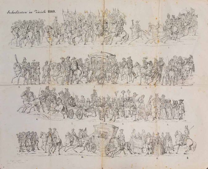 Sechseläuten in Zürich 1860. Lebende Bilder aus der Chronik der Mode. Ein Beitrag zum Anschauungsunterricht für grosse und kleine Kinder. Zürich, 1860. 2 gef. lithogr. Blatt. Blattgrösse: 54 x 66 cm. + Wichtig: Für unsere Kunden in der EU erfolgt der Versand alle 14 Tage verzollt ab Deutschland / Postbank-Konto in Deutschland vorhanden +, 348BG|348BG_2. Honegger 33. ? Darstellung des Umzuges mit 23 Sujets in 7 Reihen. ? Ohne Programm. Die Blätter mit kleineren Einrissen und stockfleckig.