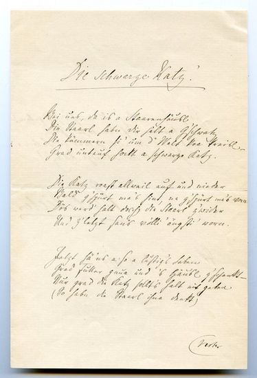"Die schwarze Katz'". Eigenh. Gedichtmanuskript (16 Zeilen) mit U. München, April 1879. 1? SS. auf Doppelblatt. Gr.-8vo. "Bei uns, da is a Staarenhäusl, | Die Staarl habn dir halt a G'schwatz | Die kümmern si um d'Welt koa Kreisl - | Grad untauf hockt a schwarze Katz [...]". - Der aus München stammende Jurist war u. a. mit Paul Heyse und Emanuel von Geibel befreundet, gehörte mit ihnen der Künstlergruppe "Das Krokodil" an "und zählte zu den führenden Persönlichkeiten der Münchner Kulturszene" (DBE). Mitarbeiter der "Fliegenden Blätter", verfaßte er u. a. Reisebeschreibungen, wurde aber vornehmlich durch seine von Franz von Kobell beeinflußten humorvollen Mundartdichtungen bekannt.