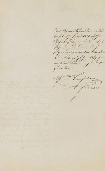 Brief mit eigenh. U. ("Eh. Wilhelm Fmlt"). Wien, 29. IV. 1859. 1? SS. auf Doppelblatt. Folio. An Erzherzog Karl Ferdinand über die Übergabe des Kommandos des Husaren-Regiments Nr. 7 an Oberst Adalbert Graf Zichy. - Erzherzog Wilhelm, Sohn des Siegers von Aspern, Erzhzg. Karl, und Henriette von Nassau-Weilburgs, durchlief eine straffe militärische Laufbahn und war zuletzt General-Artillerieinspektor. 1863 übernahm er das Hoch- und Deutschmeisteramt von Maximilian Josef und übte es bis zu seinem Tode aus. - Auf Briefpapier mit blindgepr. Briefkopf.