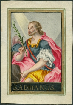 S. Adrianus. o.O., -, o. J. [um 1750]. Orig. Gouache-Aquarellzeichnung. ca. 12 x 8,4 cm [Blatt]., Abbildung. Im Randbereich goldgehöhtes Pergamentbild des 18. Jahrhunderts in altmeisterlicher Manier. Rückseite mit hds. (spätere) Widmung "Zum frommen Andenken an Anna Gruber". - Randbereich alt beschnitten, etw. berieben in Titelei, dort kl. alte Retusche im Schwarz.