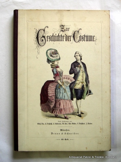 2 Bände München, Braun & Schneider, ca. 1905. Fol. (34 : 24 cm). 125 doppelblattgroße (34 : 43 cm) kolorierte Holzstichtafeln mit Kostümdarstellungen nach W. Diez, C. Fröhlich u.a. Illustrierte Orig.-Halbleinenbände mit kolorierten Deckelillustrationen; gering fleckig, Kolorit an einer Stelle etw. verwischt. Colas 1234; Eichler 59ff. - Wegen der historisch exakten Darstellungen auch heute noch geschätztes, dekoratives kostümgeschichtliches Werk. Die Serie "Zur Geschichte der Costüme" erschien im Rahmen der seit 1848 vierzehntägig veröffentlichten "Münchener Bilderbogen". Zu Jahresende wurden diese Bögen in einem thematisch unzusammenhängenden Jahresband zusammengefasst. Die Serie "Zur Geschichte der Costüme" wurde 1861 begonnen und nach 32 Bögen erstmals auch als Themenband veröffentlicht. Mit dem 50. Jahrgang (1898) stellte der Verlag die regelmäßige Veröffentlichung der "Münchener Bilderbogen" ein. Bis 1905 erschienen neue Bögen nurmehr vereinzelt und in unregelmäßiger Reihenfolge, darunter auch die letzten 25 Bögen der kostümgeschichtlichen Serie. - Sehr schönes, sauberes Exmplar in farbfrischem Kolorit.