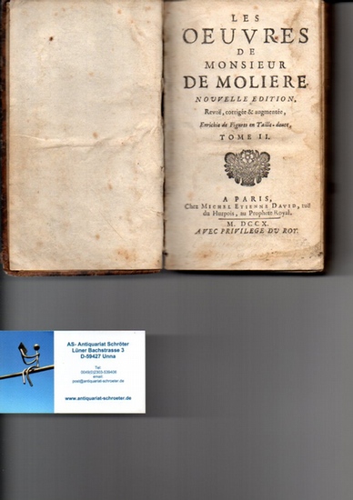 Les Oeuvres de Monsieur de Moliere. Nouvelle Edition, revue, corrigee & augmentee, enrichie de figures en taille-douce. Tome II. Avec privilege du Roy. Chez Michel Etienne David, rüo du Hurpois, au Prophete Royal, Paris, 1710. 372 Seiten, OLeder-Einband auf 5 Bünden, goldverzierter Rücken. Mit 5 ganzseitigen Kupferstichen und zahlreichen Zierbordüren und Schlußvignetten. Die Einbanddeckel berieben, der Rücken mit größeren Fehlstellen an den Kapitalen; der Buchblock jedoch fest. Wenige Flecken im Text. Akzeptables Exemplar. <**UTFAQ**>Actually it is not possible, sending books to the USA. Aktuell können keine Bücher in die USA versandt werden.**UTFAQ**>.