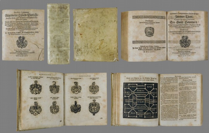Der klein Solothurner Allgemeine Schaw-Platz Historischer Geist- auch Weltlicher vornembsten Geschichten und Händlen, welche sich von Anfang der Welt biss auff gegenwärtige Zeit in Helvetien, Teutschland, Franckreich, Italien, Spanien, Engelland, auch andern Orthen zugetragen, in schöner Chronologischer Ordnung, mit beygefügten Notis und nutzlichen Erinnerungen, zum Verstand der Historyen sehr dienstlich. Solothurn, Johann Jacob Bernhardts, durch Michael Wehrlin., 1666. Klein-4°. 13 (statt 14) n.n. Bl., 722 S. 1 Bl. Schutz-Schrift und Druckermarke; Titel, 441 S., 1 S. Druckermarke. Mit 39 heraldischen Holzschnitten in "Dedication" und 2 Holzschnitttaflen im 1. Teil. Pergamentband der Zeit mit handschriftlichem Rückentitel. 2 Teile in 1 Band. Haller IV, 780. - Barth 19624. - Erste Ausgabe. - Das Bedauern Hallers über die "vielen fabelhaften und abergläubischen Erzählungen" der Chronik machen heute Ihren Reiz aus. Haller ist jedoch des Lobes voll über die fundierten Quellenstudien im zweiten Teil. Der erste Teil der Chronik erzählt die Geschichte der Menschheit in der Chroniktradition des 15. und 16. Jahrhunderts mit Solothurn als Mittelpunkt der Welt. "Seine Lebendigkeit, seine herzliche Teilnahme machen ihn zu einem der Sprühenden unter den steifleinernen Zeitgenossen ... Sehr richtige Bemerkungen macht er über den Bauernkrieg." (Feller/Bonjour I, 425ff.). - Durchgehend, wie immer, stark gebräunt. Die ersten 5 Blätter mit grösseren Einrissen durch Wurmspuren. Einzelne Wurmspuren am Rand. Stellenweise auch fingerfleckig. Es fehlt, wie häufig, der Vortitel zum ersten Band und ohne die Register zu den 2 Teilen, die offenbar separat nachgeliefert wurden.