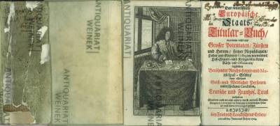 Das neueröffnete Europäische Staats-Titular-Buch/ worinnen nicht nur Grosser Potentaten / Fürsten und Herren / freyer Republiquen/ Hoher und Niederer Collegien/ vornehmer Hof-Staats- und Kriegs-Ministren/ Räthe und Officianten/ ingleichen Berühmter Reichs-freyer- und Municipal-Städte/ dann allerhans Geist- und Weltkicher Personen unterschiedener Conditionen, Teutsche und Frantzös. Titul enthalten/ Sondern auch ein und anders durch curieuse Anmerkungen erläutert/ und die Titulaturen deren hohen Häuser nach ihren Genealogien gesetzet. Leipzig, Lanckischens Erben, 1709. Frontispiz + Titel + 14 n.n. Bll. + 1192 S. + 56 Bll. OPgm. der Zeit., Abbildung. EA. Titel in Rot und Schwarz gedruckt. Mit einem gestochenen Frontispiz. - Besitzsign. a. T. u. V., R. m. Fehlstellen sowie fleckig - tlw. m. Japanpapier stabilisiert, tlw. stockfleckig, Gbrsp. - Lünig, (1662- 1740), studierte in Jena und Helmstedt Rechtswissenschaften und reiste anschließend als Hofmeister zweier Adliger durch Italien, England, die Niederlande und Frankreich. Nach kurzer Zeit als Verwaltungsmitarbeiter seines Onkels im fränkischen Hartenstein unternahm er Reisen nach Rußland, Dänemark und Schweden. Später trat er in Wien in militärische Dienste, wurde nach der Teilnahme am Pfälzischen Krieg Amtmann in Eilenburg (Sachsen) und war von Anfang des 18.Jh. bis zu seinem Tod Stadtschreiber in Leipzig. Lünig zählt zu den bedeutendsten Kompilatoren des deutschen Verwaltungsrechts. Seine 1710-22 veröffentlichte Sammlung von Reichsakten Teutsches Reichs-Archiv (TRA, 24 Bde.) gilt heute noch als unentbehrlich. (DBE).