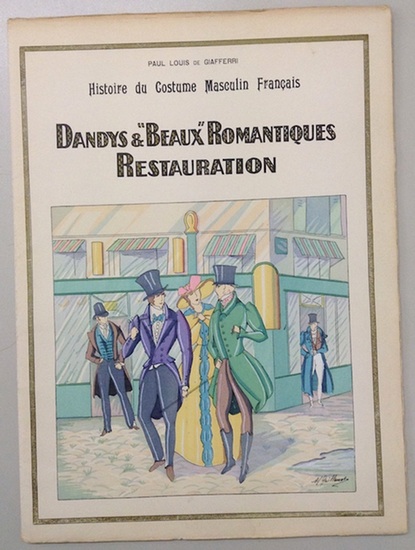 Histoire du costume masculin Francais de l'an 420 à l'an 1870. La Gaule - Le Moyen-Age - La Renaissance - Louis XIII. - Louis XIV. - Louis XV. - Louis XVI. - La Révolution - L'Empire - Le Second Empire. Paris, Editions Nilsson, 1927. Folio. 99 (von 100) Tafeln mit Pochoir-Kolorit und 40 Blatt Text lose in 10 illustrierten Originalumschlägen. Alles zusammen in Originalleinen-Mappe mit neuen Schließbändern und montierter kolorierter Deckelillustration (Mappe berieben u. teils fleckig, Außengelenke angeplatzt, Umschläge mit Läsuren). Mit ansprechenden Darstellungen französischer Männermode von der gallo-römischen Zeit bis zum Seconde Empire. Die Tafeln zeigen Alltags- und Festkleidung, Mäntel, Hüte, Gürtel und Schilde, Ärmelformen, Hemden, Westen, Stoffe, Stickereien, Schuhe und Accessoires sowie Schmuck, von verschiedenen Illustratoren gestaltet und mit leuchtendem Pochoir-Kolorit versehen. - Colas I, 1244. - Innen gebräunt u. teils angestaubt, vereinzelt minimal feuchtrandig. Es fehlt Tafel 10 aus Heft 6.
