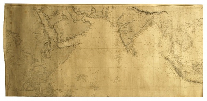 Indian Ocean. [London], Hydrographic Office, no year. 132.5 x 55 cm. Includes the Arabian Peninsula with the Arabian Gulf. Engraved chart, with tidal information, compass roses, soundings, seabed notations, currents and sandbanks. Lighthouses and beacons picked out in red and yellow. Signs of contemporary use, with several pencil markings. - Not in the Al Ankary or Al-Qasimi collections.