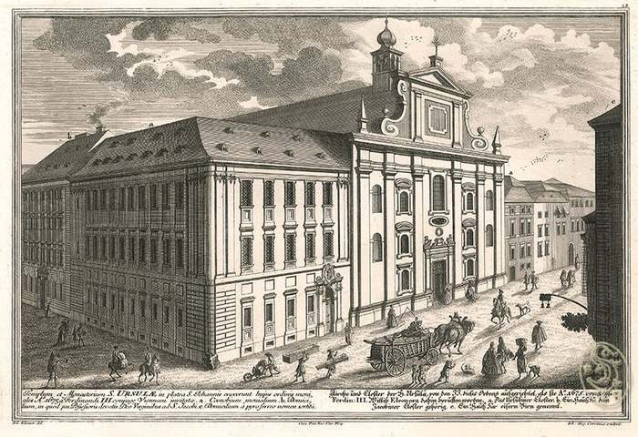 Kirche und Closter der H. Ursula, von den JJ. dieses Ordens aufgerichtet, als sie A°.1675 von Keysers Ferdin. III... Augsburg, Pfeffel 1725. Orig.-Kupferstich von I. A. Corvinus aus Salomon Kleiner. Vera et accurata delineatio...Wahrhaffte und genaue Abbildung Aller Kirchen und Clöster.. 22,5 x 33,5 cm. (Bildausschn.). Breitrandiger, kräftiger Abdruck. Nebehay-W. 306, I, 18 - An diesem Ort in der Johannesgasse-Seilerstätte befindet sich heute die Hochschule f. Musik u, darstellende Kunst.