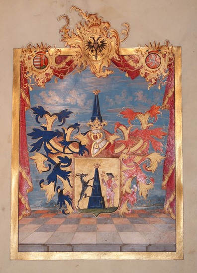 Adelsdiplom für Leopold Joseph und Karl Joseph Fritz von Küstenfeld, Wien 6. 2. 1764. Mit eigenhändiger Unterschrift der Kaiserin, gegengezeichnet von Graf Rudolf Graf Chotek und JChr von Bartenstein. Wien, 1764. Pergamentlibell im roten Samteinband, ca. 38 x 32 cm, gelbe Schließbänder (teils fehlend) und Kordelheftung mit Holzkapselsiegel (Deckel und eigentliches Siegel fehlen), 1 Bl, 20 S, 1 Bl.; Handschrift mit kalligraphierten Initialen sowie erste 3 Seiten mit opulenten Bordüren sowie 1 ganzseitigen und prächtigen Wappendarstellung im Goldrahmen überhöht mit gekröntem Doppeladler. Einband nur wenig gebraucht, Pergament teils etwas (finger)fleckig, das Wappen mit leichtem Abklatsch, bis auf die fehlenden Teile insgesamt gut erhalten.