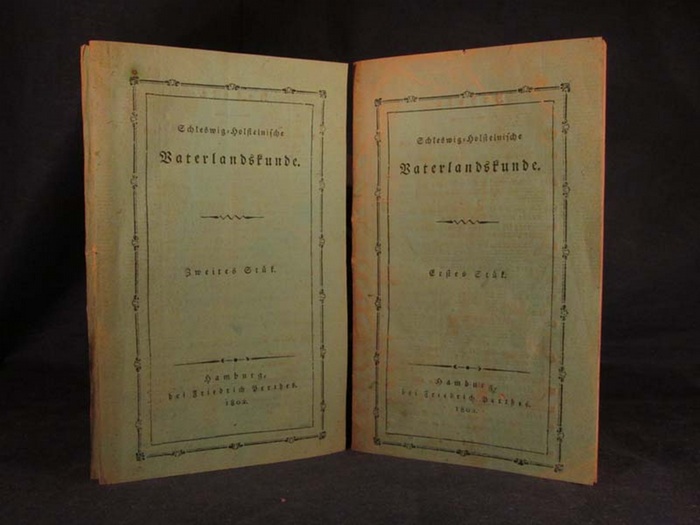 Schleswig-Holsteinische Vaterlandskunde. Verhandlnugen, Bemerkungen, Nachrichten zur nähern Kentnis der Herzogthümer Schleswig und Holstein und zum gemeinsamen Nuzen ihrer Bewohner. Erstes und Zweites Stük. Hamburg, Friedrich Perthes, 1802. LII, 224 S., 2 Bl., 236 S. Grüne Original-Broschuren. Auszüge aus dem Inhalt: Bemerkungen über den Obstbau - Beschreibung der Stadt Altona - Nachricht von der Husumer Bürgerschule - Bemerkungen über unsere Fischereien - Taubstummeninstitut in Kiel - Landwirthschaftliche Nachrichten aus Dithmarschen - Reise durch Schleswig und Holstein - Schulnachrichten aus Dithmarschen - Bemerkungen über Tönnings Fortschritte in gewerblicher und sittlicher Hinsicht - Nachrichten zur Kentnis des politischen und ökonomischen Zustandes der Stadt Altona - Verzeichnis der Vorlesungen auf der Universität Kiel zum nächsten Wintersemester - Lans- und hauswirthschaftliche Maschinen und Werkzeuge. Bd. 1 leicht berieben. Sonst sehr gute Exemplare; seiten sauber und nahezu fleckenfrei. Weitere Fotos auf der Homepage des Antiquariats (bitte Art.-Nr. auf der Angebotsseite in das Suchfeld eingeben).