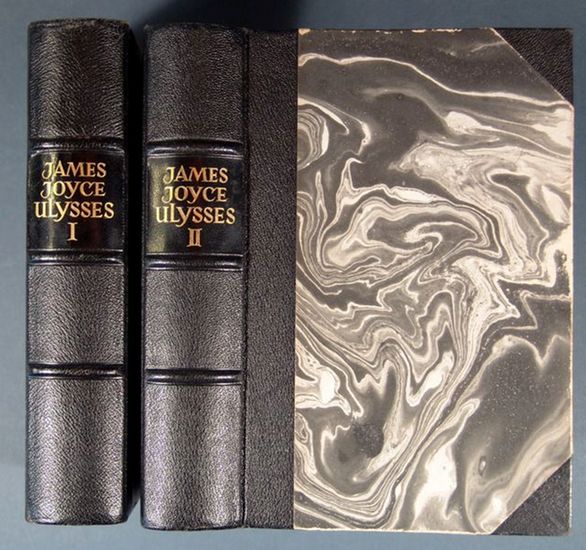 Ulysses. Vom Verfasser geprüfte definitive deutsche Ausgabe von Georg Goyert. 2 Bde. - Zch.: Rhein-Vlg. 1930. 4 Bll., 632 Ss., 1 Bl.; 4 Bll., 611 Ss. 8°. Schwarzes HSaffianLd. mit 3 aufgesetzten Bünden, goldgeprägt. Rückentitel, marmor. Bezugspapier, Kopfgoldschnitt (Kanten tls. etw. berieben). ERSTE ÖFFENTLICHE DEUTSCHE AUSGABE. - Roman von James Joyce (1882-1941), entstanden 1914-1921, auszugsweise 1918-1920 vorabgedruckt in der Zeitschrift 'The Little Review', Erstausgabe 1922; die erste deutsche Ausgabe erschien 1927 in Basel als Privatdruck. - "Die kompositorische Stringenz des 'Ulysses', die Sprachbehandlung und die Präzision der Detailbeobachtung haben für die Romankunst Maßstäbe gesetzt, denen im 20. Jahrhundert wenige andere Werke ... gerecht werden. Fortgewirkt hat vor allem die Technik des inneren Monologs, die sich z.B. bei Döblin, in Thomas Manns 'Lotte in Weimar', in Hermann Brochs 'Tod des Vergil', bei Alfred Andersch, Uwe Johnson und Arno Schmidt findet." (KNLL VIII,914 ff.). - Georg Goyert (1884-1966), Literarhistoriker und Übersetzer; vgl. Kosch3 VI,663 ff. - Vgl. Hack 30.3 (dem vorliegenden Exemplar steht folgender Satz voran: "Diese Ausgabe erfolgte 1930 auf Grund vorhergegangener Suskription.") - Titel in Rot und Schwarz. - Vorsatzpapier im Gelenk etw. brüchig, in Bd. I verstärkt; Schnitt tls. leicht fingerfleckig. - Gut erhaltenes Exemplar der Halblederausgabe.