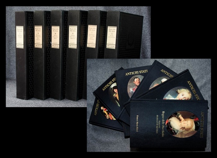 Regno delle Due Sicilie (1734-1860). 6 volumes. Milano, Franco Maria Ricci, 1996-, 1997. circa 26,6 x 16,5 cm (book)., 283, 279, 275, 287, 285, 299 pp., with several tipped-in pictures. Original hardcover with gilt black silk in decorated box (circa 28 x 19 cm) Antichi Stati, collana diretta da Gianni Guadalupi. - Regno delle Due Sicilie. Tomo I: Real Citta di Napoli. Tomo II: Principato Ultra & Citra, Terra di Lavoro. Tomo III: Abruzzo Ultra & Citra, Molise. Tomo IV: Calabria Ultra & Citra, Basilicata. Tomo V: Capitanata, Terra di Bari, Terra d'Otranto. Tomo VI: Sicilia di la dal Faro. - Nice copy, only the boxes a little dusty, books crisp.