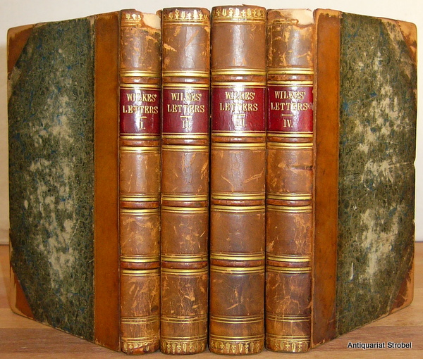Letters, from the year 1774 to the year 1796, of John Wilkes, Esq. addressed to his daughter, the late Miss Wilkes: With a collection of his miscellaneous poems. To which is prefixed a memoir of the life of Mr. Wilkes. 4 Bände. London, Longman etc. 1804. 2 Bl., 207 S.; 2 Bl., 264 S.; 328 S.; 2 Bl., 277 S. Mit 2 gestochenen Porträts. Kl.-8° (15,5 x 10,5 cm). Halbleder des 19. Jahrhunderts mit Rückenfileten und Rückenschild. Erste Ausgabe. - Band III ohne die beiden Blätter Titelei (Titel, Inhalt). - Stellenweise stockfleckig, teils angestaubt und etwas wasserrandig, Vorsätze in den Rändern leimschattig, ein Blatt ind Band IV eingerissen. Die Einbände berieben und etwas bestoßen, Vordergelenke der Bände I und IV rissig, zwei Kapitale mit Absplitterungen. - Lacks two leafs in vol. III (title, contents). - Somewhat foxed, dust- and waterstained, one leaf in vol. IV with tear. Bindings rubbed, two front hinges weak, heads of spine with two chippings. *Allibone 2721, 13. Lowndes 2921 (datiert 1805).