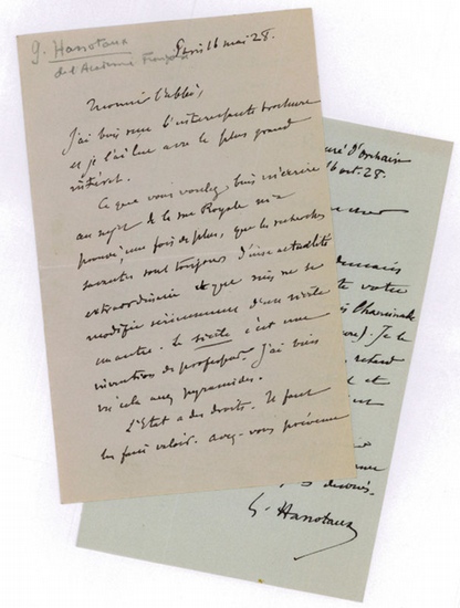 2 autograph letters signed. Paris, 16. V. 1928 and 16. X. 1928. 8vo. Together 3 pp. Both to a clergyman and fellow member of the Académie Française, very likely to be Henri Bremond. In the earlier letter, Hanotaux thanks the recipient for a brochure and talks about the relevance of old research, mentioning a "Rue Royale" and that "Sicily is an invention of professors", comparing it to speculations about the pyramids. In the second part of the letter, he mentions mutual friends including the journalist and critic André Hallays and the journalist and novelist Louis d'Illiers. - In the letter from October, Hantaux announces his return to Paris and promises that he will forward a letter by the recipient concerning a Louis Chaminade from Pons (Charente-Maritime) to the secretariat of both the Institut de France and the Académie Française and recommend Chaminade.