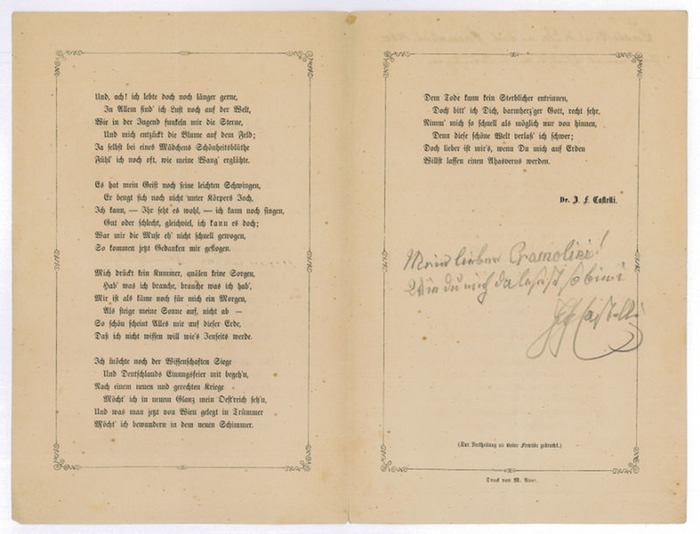 Gelegenheitsdruck mit eigenh. Beschriftung und U. Wien, 6. III. 1860. 3 SS. auf Doppelblatt. Gr.-8vo. "Zu meinem 80ten Geburtstage | am 6. März 1860 [...] (Zur Vertheilung an meine Freunde gedruckt.) Druck von M. Auer". - Gelegenheitsgedicht (48 Zeilen) mit eigenh. Beschriftung und U.: "Mein lieber Cramolini! Wie Du mich da lesest so bin i [...]". - In Bleistift; gering fleckig.
