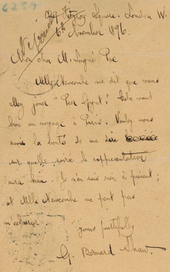 Eigenh. Postkarte mit U. ("Bernard Shaw"). London, 6. XI. 1896. 1 S. 8vo. Mit eh. Adresse. An den Theaterdirektor und Schauspieler Aurélian Lugné-Poe (1869-1940) in Paris: "Mlle Newcombe me dit que vous allez jouer 'Peer Gynt'. Cela vaut bien un voyage à Paris. Voulez-vous avoir la bonté de me dire sur quelle soirée la reppresentation [!] aura lieu. Je n'en sais rien à présent; et Mlle Newcombe ne peut m'èclairer [...]". - Aurélian Lugné-Poe hatte drei Jahre zuvor sein Theatre de I?Oeuvre gegründet und damals auch schon ein Stück Ibsens, nämlich "Rosmersholm", aufgeführt. - Papierbedingt leicht gebräunt und mit einem winzigen Stecknadeldurchstich.