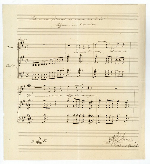 Eigenh. Musikzitat mit U. ("W. F. G. Nicolai"). O. O., 29. VIII. 1881. 1 S. Gr.-4to. Hübsches, großformatiges Albumblatt: sechs Takte für Tenor und Klavierbegleitung ("No. 2 aus Opus 1", "Ich muss hinaus, ich muss zu Dir" nach Heinrich Hoffmann von Fallersleben). Nicolai wirkte ab 1865 als Direktor der königlichen Musikschule in Den Haag und Lehrer am dortigen Konservatorium. Mit seiner Zeitschrift "Caecilia" förderte er nach Kräften Wagner und Liszt. "Hoffmann lernte Nicolai am 26. August 1855 in Den Haag kennen, als dieser bei J. W. Holtrop u. a. Lieder von ihm spielte; er vertonte Gedichte Hoffmanns, u. a. 'Glücklich wer auf Gott vertraut', 'Ich muß hinaus, ich muß zu dir' und 'Loverkens'" (E. Poettgens, Hoffmann von Fallersleben und die Lande niederländischer Zunge, S. 579f.). - Oben und unten auf ein knapp quadratisches Maß beschnitten; Spuren mittiger Querfaltung.