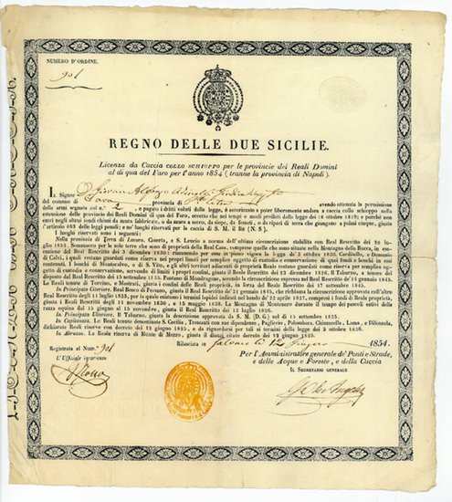 Licenza da caccia collo schioppo per le provincie dei Reali Domini al di qua del Faro per l'anno 1854 (tranne la provincia di Napoli). Salerno, 12. VI. 1854. 1 S. Handschriftlich ergänzter Formulardruck, 278 x 308 mm. Im Namen des Königreichs beider Sizilien ausgestellter Jagdschein Nr. 901 für den Juristen Giovanni Alfonso Adinolfi aus Cava de' Tirreni, dem die Jagd mit der Flinte in den "Reali Dominii al di qua del Faro" (den Festlandsprovinzen des Königreichs, dem Königreich Neapel) mit genau bezeichneten Ausnahmen gestattet wird. Adinolfi trat auch als Historiker seines Heimatorts hervor (Storia della Cava, distinta in tre epoche. Salerno, R. Migliaccio, 1846). - Amtsunterschriften, Stempel, in den Faltungen kl. Randeinrisse.