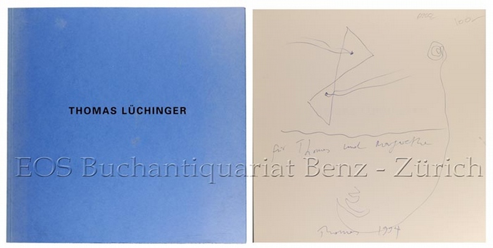 Thomas Lüchinger. Malerei 1990-1994. O.O., 1994. Folio. (7) Bl. Mit 12 farbigen Tafeln. Orig.-Broschur. + Wichtig: Für unsere Kunden in der EU erfolgt der Versand alle 14 Tage verzollt ab Deutschland / Postbank-Konto in Deutschland vorhanden +, Einband und Bild. Mit einer Originalskizze mit Widmung des Künstlers auf dem ersten Blatt. - Publikation anlässlich der Verkaufsausstellung in der Galerie Werner Bommer.