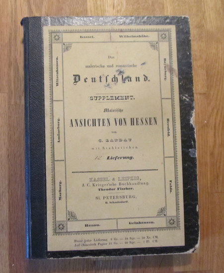 Malerische Ansichten von Hessen Kassel: Verlag von Theodor Fischer (J.G. Krieger`sche Buchhandlung). 1842. mit 36 Stahlstichen (sind sogar gezählte 38 Stahlstiche im Buch). 267 S. gr. 8°. -------------- Mit Ansichten u. a. von: Kassel, Marburg, Hanau, Fulda, Eschwege, Witzenhausen, Bad Hersfeld, Gelnhausen, Breitenau, Kaufungen, Schweinsberg, Homberg, Ludwigstein, Haina, Amöneburg ////////////// Johann Georg Landau (* 26. Oktober 1807 in Kassel; gest. 15. Februar 1865 Kassel) war ein deutscher Archivar und Historiker. Landau hatte keine höhere Schulbildung, dennoch begann er 1826 mit eigenen historischen Studien im Kasseler Stadtarchiv und der Bibliothek. Hier wurden die Bibliothekare Jacob und Wilhelm Grimm und der Archivdirektor Dietrich Christoph von Rommel auf Landau aufmerksam. Er bekam erste archivarische Arbeiten zugewiesen. Durch seine erste Veröffentlichung zwischen 1832 und 1839, der "Hessischen Ritterburgen und ihre Besitzer", bewies er seine wissenschaftlichen Fähigkeiten. 1835 wurde er kurfürstlicher Archivar und 1838 Archivsekretär. Mit seinen Werken ist er zu einem Begründer der modernen geschichtlichen Landeskunde geworden.