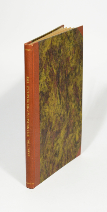 Bibliografia di opere antiche e moderne di chiromanzia e sulla chiromanzia con notizie biografiche sui principali autori. Reggio Emilia, Nironi & Prandi, 1946. 8°. Mit 5 Tafeln. 110 S., HLwd. d. Zt. m. goldgepr. Rückentitel u. eingeb. illustr. OUmschlag. Erstausgabe. - Eines von 20 (ges. 220) nicht numerierten und nicht für den Handel bestimmten Exemplaren. - Verzeichnet 605 Werke. - Papierbedingt (bes. Ränder) etw. gebräunt.