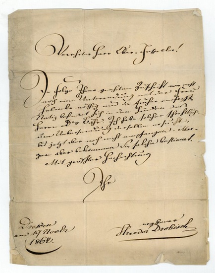 Eigenh. Brief mit U. Dresden, 19. XI. 1860. 1 S. Folio. Mit eh. Adresse (Faltbrief). An Herrn Ober-Inspector Seiffert: "In Folge Ihrer geehrten Zuschrift war erst noch eine Unterredung mit der Frau Helmke nöthig und die früher verfasste Notiz befindet sich in den Händen des Herrn Dr. Bähr. Ich habe solchen schriftlich um Uebersendung derselben ersucht, bis jetzt aber noch nicht empfangen. Morgen aber bekommen Sie solche bestimmt [?]".