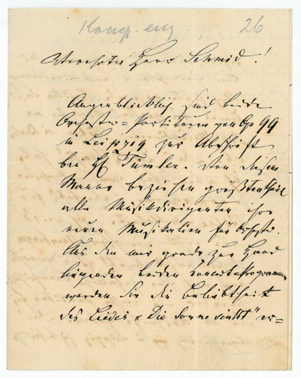 Eigenh. Brief mit U. Schwerin, 26. III. 1876. 3 SS. 8vo. "Augenblicklich sind beide Orchester-Partituren von Op. 99 in Leipzig zur Abschrift bei Tümler. Von diesem Manne beziehen größtentheils alle Musikdirigenten ihre neuen Musikalien für Orchester. Aus dem mir gerade zur Hand liegenden beiden Konzert-Programmen werden Sie die Beliebtheit des Liedes ?Die Sonne sinkt' ersehen [?]". - Kücken war als Flötist, Bratschist und später als Erster Geiger Mitglied des großherzoglichen Theaterorchesters. Er kam an den Hof des Großherzogs Paul Friedrich von Mecklenburg-Schwerin, setzte seit 1832 seine Studien in Berlin fort und wurde Musiklehrer des Prinzen Georg von Cumberland, des späteren Königs von Hannover. 1841 wurde er Kompositionsschüler Simon Sechters in Wien, war 1843 Dirigent von Männergesangsfesten in der Schweiz und wurde zum Schweriner Hofkomponisten ernannt. Nach weiteren Studien in Paris wurde er Stuttgarter Hofkapellmeister. Seit 1857 lebte er als freier Komponist in Schwerin.