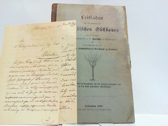 Leitfaden für den Betrieb des praktischen Obstbaues. Mit dem Obstsorten-Verzeichniß für die Provinz Hannover und 37 in den Text gedruckten Abbildungen. Hildesheim, August Lax Verlag, 1889. 8°, VI, 81 und 21 Seiten, illustr. OPbd. mit Leinenrücken - Einband ber. und leicht fleckig sonst guter Zustand - 1889. Beiliegend 2 Originalbriefe des Verfassers an August Lax (den Verleger) ! ! c81205.