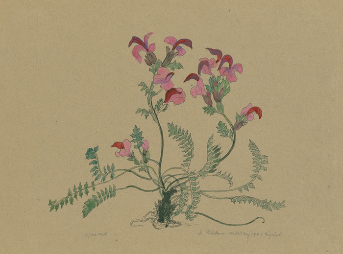Blühendes Wiesenkraut. _. Feder in Schwarz, aquarelliert, auf grau-braunem Papier, rechts unten signiert und datiert ?E. Pelikan Mittelberg 1903 August?, links unten bezeichnet ?2700 Met(er)?. 18,5:25 cm. Der untere Rand unregelmäßig geschnitten.