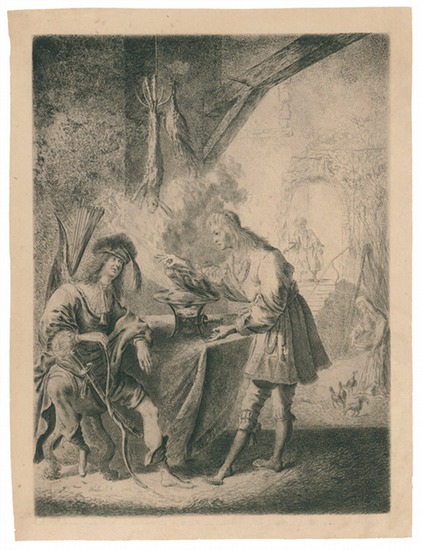 Esau verkauft sein Erstgeburtsrecht an Jakob. _. Radierung, auf Bütten Wasserzeichen: undeutlicher Schriftzug. 27,6:20,3 cm. Literatur: Nagler 6; Rovinski (Elèves de Rembrandt) 443-445; Wurzbach 1; Hollstein 1, II (von III), mit dem Namen Rembrandts links unten in der Platte. - Sehr guter Abdruck mit vollem Rand um die Plattenkante. Papier etwas gebräunt.