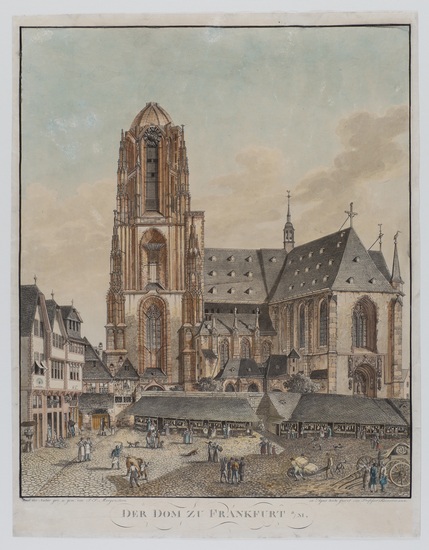 Der Dom zu Frankfurt a/M. mit dem Pfarrturme und den Fleischschirnen, vom Leinwandhause gesehen. _. In zarten Farben aquarellierte Aquatinta, nach J.F. Morgenstern (1777-1844), 1813, auf cremefarbenem Velin. 47:36,6 cm. Fehlstelle im oberen Rand ergänzt und kleine Einrisse (außerhalb der Darstellung) sauber restauriert, auf die Plattenkante geschnitten. Literatur: Gwinner (J.F. Morgenstern) 90; Nagler 18; vgl. I. Eichler: Die Frankfurter Malerfamilie Morgenstern in fünf Generationen, Frankfurt am Main 1982, Abb. S. 27. Ersten Malunterricht erhielt Reinermann in Wetzlar bei dem Porträtmaler Cramer. Anschließend machte er eine Ausbildung bei J.A.B. Nothnagel (1729-1804) in Frankfurt am Main. Danach arbeitete er als Tapetenmaler in Wetzlar. 1786 wurde er Maler im Weilburger Schloß. 1789 ging er nach Kassel und studierte in der dortigen Galerie Landschaftsmalerei. Im Herbst 1789 begleitete er L.P. Strack (1761-1836) nach Rom und war dort 1789-1790 Schüler von L. Ducros (1748-1810), bei dem er die Aquarellmalerei erlernte. Von 1793-1803 war er in Basel bei Chr. von Mechel (1737-1817) in dessen Verlag tätig, 1803-1811 in Frankfurt am Main, 1811-1818 in Wetzlar, danach wieder in Frankfurt am Main. 1812 wurde er zum Professor ernannt. 1818 erfolgte eine Anstellung an der Kunstschule in Frankfurt am Main.