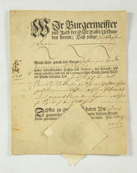 Gedrucktes und handschriftlich ausgefülltes Gesundheitsattest mit drei papiergedeckten Siegeln. Basel, 14. VIII. 1722. 2 Bll., 8°. ?Wir Burgermeister und Rath der Statt Basel, Urkhunden hiemit; Daß [...] Unser getreue liebe Burger [...] von hierauß, als einem gesunden und von all Contagiosischer Seuche durch Gottes Gnade befreyten Ort [...]? kommt. Auf den Seiten zwei und drei mit handschriftl. Bestätigungen: ?Passirt Straßburg? (17. VIII. 1722) bzw. ?Passirt Nürnberg, bey, Gott Lob! gesunder Luft? (29. VIII. 1722). Auf der letzten Seite noch ein Vermerk ?Nürnberg [...] Wolfgang Pflüger?. - Gefaltet.