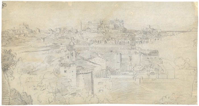 Rom, Blick von den Caracallathermen auf San Giovanni in Laterano, 1824/25. _. Bleistift, mit nur teilweise sichtbarer Umfassungslinie, auf gelblichem Transparentpapier. 23,5/23,2:43,8 cm. - Rechte obere Ecke ergänzt, mit mehreren winzigen Löchlein. Vgl. Wechssler WV 163: ?Rom, Blick von den Caracallathermen auf San Giovanni in Laterano?, Abb. S. 177. Die an dieser Stelle aufgeführte sowie die hier vorliegende Zeichnung stehen in Zusammenhang mit den gemeinsam mit Joseph Thürmer (1789-1833) geplanten Radierungen mit Romansichten aus verschiedenen Himmelsrichtungen, von denen aber nur die südöstliche Ansicht verwirklicht wurde (vgl. Wechssler WV 772); Lehmann, S. 193, Nachlaßnummer ?504?, ?Kaiserpaläste in Rom, 1825?, geschätzt mit 22 Gulden. Obwohl verso die Nachlaßnummer - üblicherweise mit Bleistift geschrieben - fehlt, was mit der Feinheit des Papieres zu erklären ist, handelt es sich wohl um die im Nachlaßverzeichnis genannte Zeichnung. Die Bezeichnung ?Kaiserpaläste? stammt von Koopmann, der das Inventar erstellte. Wechssler schreibt dazu im WV, S. 27: ?Im März (1824) zeichnet er vornehmlich in Rom. Durch Heinrich Hübsch (1795-1863) ist er vermutlich mit Joseph Thürmer aus München bekannt gemacht worden, mit dem er die ?nordwestliche Übersicht von Rom? plant, eine großformatige Radierung von zwei Platten, von der je eine Fries und Thürmer radieren sollen. Die Vorzeichnung und Vorlage dazu sind von Fries, die Radierung meint mit dem Titel ?nordwestliche Übersicht? den Standpunkt des Kapitolturms, von dem der Blick über die Stadt nach Südosten geht. Die Arbeit an der Platte wird bis in den April gedauert haben. Ende April und im Mai zeichnet er noch am Forum und Palatin. Dann bricht er mit Begas (Karl Begas, 1794-1854) und Heinrich Hess (1798-1863) in die Albaner Berge auf.?.