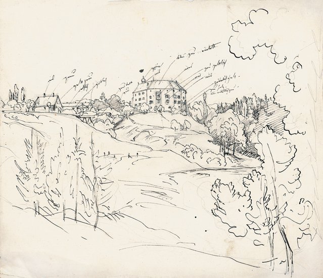 Schloß Schenna bei Meran, um 1841. _. Feder in Schwarzbraun und Bleistift, auf cremefarbenem Velin, mit zahlreichen Farbangaben innerhalb der Darstellung. 28:33 cm. - Mit Knickspuren in den Ecken.