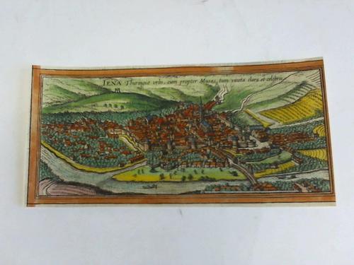 Iena Thuringiae urbs, cum propter Musas, tum vineta clara et celebris. Historische Ortsansicht. Altcolorierte Radierung um 1572 um, Braun-Hogenberg, 1572. Blattgröße 22,6 cm x 11,2 cm. Rückseitig mit lateinischem Text--- - Franz Hogenberg war ein deutscher Maler, Kupferstecher, Radierer und Verleger. Wahrscheinlich Schüler seines Stiefvaters Hendrik Terbruggen. Gab ab 1572 zusammen mit Georg Braun das berühmte Städtebuch Civitates Orbis Terrarum (in der deutschen Übertragung von Schefold: Beschreibung und Contrafactur der Vornembster Stät der Welt) heraus, wobei Hogenberg im Wesentlichen Schöpfer der Kupfertafeln war -.