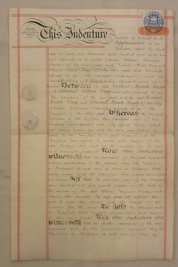 Indenture ? Which is declared to be Supplementalt o an Indenture ?. Between William Hammet Beadon ? and Herbert Meade-King ? between the said Herbert Mead-King and Edward Arthur Bigg ? Dated the 17th day of December 1900, Supplemental to a Mortage oth the 3rd day of June 1882 being a Mortage by William Hammet Beadon to Messrs. H(erbert) Meade King and E. A(rthur) Bigg to secure £ 1750 on the death of the survivor oth the said W.H. Beadon and Frances Adele Lambart his Wife. Mrssrs. H. Meade-King and E.A. Bigg to Messrs. Hand E. Meade-King. _. 39,6x25,8 cm. 4 S. Gefaltet. Gestempelt von Driwers Law Anwälten in London und Siegeln.