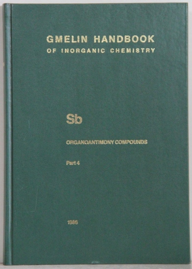 Gmelin Handbook of Inorganic and Organometallic Chemistry. (Handbuch der anorganischen Chemie). 8th edition. Sb Organoantimony Compounds. Part 4: Compounds of Pentavalent Antimony with Three Sb- C Bonds. Berlin, Springer, 1981. 25 x 17,5 cm. III, 204 Seiten. Gebundene Ausgabe. *Stempel auf der Titelseite. Unbenutzte Bibliotheksdublette in sehr gutem Zustand. ISBN 3540935355.