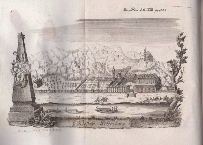 MONUMENTA BOICA. Volumen decimum tertium (13). Edidit Academia scient. Maximilianeo-Boica. (Bayerische Akademie der Wissenschaften.). Monachii (München):, Bibliopolio Elector. Academico., MDCCLXXVII (1777). 2,(1) Bl., X,533 S.,1 Tafeln, 4 Falttafeln. Späteres schlichtes Halbleinen mit Rückentitel. ######################## LIEBE KUNDEN, WIR MACHEN UNSERE JÄHRLICHE WEIHNACHTSAKTION MIT VOLLEN 30% RABATT AUF DEN GESAMTEN BESTAND UND FREUEN UNS AUF IHR INTERESSE. (Die Ermäßigung ist nun bereits im angezeigten Preis enthalten) #########################. Einband mit leichten Gebrauchsspuren. Oben etwas knapp beschnitten Rand ca. 1,5 cm. Kleiner Privatstempel auf Vorsatz. Teils etwas fleckig, Tafeln teils leicht fleckig, zum größeren Teil aber schöner und sauberer Zustand. Enthält: Monumenta Priflingensia (Prüfening) / Monumenta Weltenburgensia (Weltenburg) / Excerpta Necrologii Weltenburgensis / Bernardi Norici opsculum V. anecdotum... - Gestochene Titelvignette, Anfangs- und Schlußstücke. 1 gefalteter Kupferstich von Joseph Anton Zimmermann (Kloster Priefling) Plattengröße 18 x 25,8 cm. Außerdem 3 Kupfertafeln (davon 2 gefaltet) zu Priefling/Prüfening. 1 falteter Kupferstich von Zimmermann (Kloster Weltenburg) Plattengröße 17 x 25,6 cm. - - - ACHTUNG! Dieses Buch kann wegen seines Gewichts oder seiner Größe nur als PAKET verschickt werden. Innerhalb Deutschlands 5,30 Euro. (Portokosten ins Ausland bitte erfragen.).