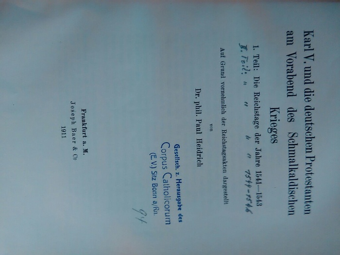 Karl V. und die deutschen Protestanten am Vorabend des Schmalkaldischen Krieges. 1. Teil: Die Reichstage der Jahre 1541-1542. 2. Teil: Die Reichstage der Jahre 1544-1546. 2 Teile in 1Band. Frankfurt, Joseph Baer 1911 / 1912. VIII, 164; (6), 161 Seiten. Gr.-8°, Halbleinen. Bibl.-Schild an Rücken, Vorderdeckel, Vorsatz und Titel gestempelt, Einband fleckig, bestossen, Text sauber mit wenigen Anstreichungen. *Frankfurter Historische Forschungen, hrsg. von Dr. Georg Küntzel, Heft 5.