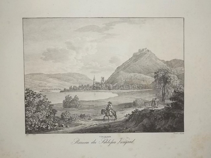 "Ruinen des Schlosses Vicegrad. Ungern". Lithographie von Adolph von Kunike nach Jakob Alt. Aus: Adolph Kunike: Zwey hundert vier und sechszig Donau-Ansichten. Wien, Kunike, 1826. Ca. 26 cm x 35 cm. Nebehay/W. 336, 140. - Schöne Ansicht der an einem Donauknie auf einem Hügel im ungarischen Komitat Pest gelegenen Ruinen des Schlosses Vicegrad, darunter am Ufer die Pfarrkirche. Im Vordergund ein Reiter. - Breitrandiges Exemplar. - Ränder etw. fleckig.