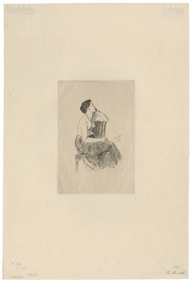Humble nudité. Armselige Nacktheit. _. Radierung, 1874, auf cremefarbenem Japan. 18,8:12,8 cm. - Verso an den oberen Ecken Reste alter Montierung. Provenienz: Sammlung Dr. H. Stinnes, Köln, Lugt 1376a. Literatur: Mascha 526, leicht verkleinerte Fassung von G. Pellet; Ramiro 567. Ein Mädchen mit reizlosem Gesicht, einfach gescheitelt in Profil nach rechts mit offener Brust und mit einem Rock bekleidet, sitzt auf einem Sessel nach rechts zu und stützt ihre Linke auf dessen Lehne, während die Rechte auf ihren überschlagenen Beinen ruht. Rops war einer der bedeutendsten Graphiker und Illustratoren seiner Zeit. Nach einer Erziehung durch Privatlehrer ging der Sohn eines Textilfabrikanten an das Jesuitenkolleg in Namur. 1849 wurde er vom Kolleg verwiesen, in diesem Jahr verstarb sein Vater, ging dann an das Königliche Athenäum in Namur, schrieb sich jedoch auch gegen den Willen seines später verhaßten Vormunds an der dortigen Académie des Beaux-Arts ein, wo er Aktkurse besuchte. 1853 setzte er sein Studium an der Universität in Brüssel fort, wo er zudem das freie Atelier Saint-Luc besuchte. Ab 1856 gründete er zusammen mit seinem Freund Ch. de Coster (1827-1879) die Zeitschrift L'Uylenspiegel, journal des débats littéraires et artistiques, für die er bis 1857 Illustrationen schuf, meist Karikaturen. Nach der Verheiratung mit Charlotte Polet de Faveaux, der Tochter des Gerichtspräsidenten von Namur, lebte er abwechselnd in seiner Geburtsstadt und im Sommer auf Schloß Thozée bei Mettet, wo ihn auch zahlreiche Künstlerfreunde besuchten; später kamen noch Paris und Brüssel als ständig wechselnde Aufenthaltsorte hinzu. 1868 war er Mitbegründer der ?Société des Beaux Arts?. 1869 verliebte er sich in die Schwestern Léontine und Aurélie Duluc, zwei junge Modeschöpferinnen, mit denen er ab 1874 in Paris zusammenlebte und auch Kinder hatte. Reisen unternahm er in den nächsten Jahren an die Nordsee, nach Skandinavien, Ungarn und Spanien, in die Vereinigten Staaten und nach Nordafrika. 1888 wurde ihm der Orden der französischen Ehrenlegion verliehen. Rops hatte vor allem großen Erfolg als Illustrator, zuerst mit den Werken de Costers, dann arbeitete er auch für Baudelaire, mit dem er sich befreundete, sowie für J. Barbey d'Aurevilly, St. Mallarmé, P. Verlaine, J. Péladan u.a.