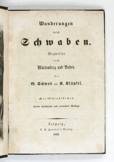 Wanderungen durch Schwaben. Wegweiser durch Würtemberg und Baden. Mit 30 Stahlstichen. Dritte veränderte und vermehrte Auflage. Leipzig, C. A. Haendel, 1851. IV, 244 SS. Mit 30 Tafeln in Stahlstich (dav. 1 als Frontispiz). Halbleinenband der Zeit mit goldgepr. Rückentitel. 8vo. Dritte Ausgabe. - Die hübschen Tafeln zeigen Ansichten von Eßlingen, Marbach, Heilbronn, Bad Wimpfen, vom Schwalbennest bei Neckarsteinach, von Heidelberg, Maulbronn, vom Reußenstein, von Hohenaurach, der Nebelhöhle, Tübingen, Hohenzollern, Freiburg im Breisgau, Lindau, Konstanz etc. - Durchgehend schwach stockfleckig. Aus der Bibliothek des Vorarlberger Rechtsanwalts Dr. Karl J. Steger.