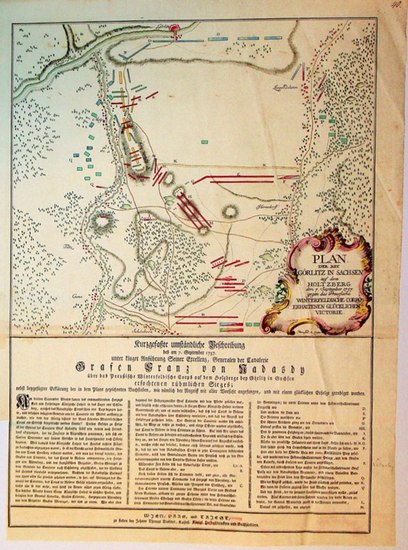 SIEBENJ?HRIGER KRIEG, SEVEN YEARS' WAR, 1757 MOYS, SCHLACHT VON MOYS, BATTLE OF MOYS Titel: Plan der bey G?rlitz in Sachsen auf dem Holtzberg den 7. September 1757 gegen das preussische Winterfeldische Corpo erhaltenen gl?cklichen Victorie. Wien, Verlag Johann Thomas Trattner, ca. 1757. Landkarte, map, teilkolorierter Kupferstich gestochen von Mansfeld mit beigef?gter Legende, Format ca. 43 x 61 cm.