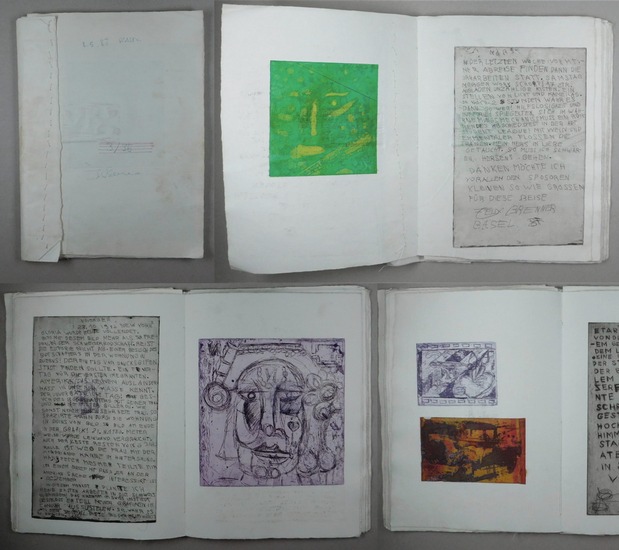 (Tagebuch New-York). 1987. _. 38x28 cm. 56 S. Mit 16 Originalradierungen in Farbe und 16 radierte Textblätter und Holzschnittvignetten Von Hand geheftet Blätter. Vom Künstler auf der ersten Seite signiert, datiert 8.5.1987 und numeriert 3/35. - Die Biografie von Felix Brenner verläuft wie ein Abenteuerroman. 1955 in Basel geboren, bricht er mit dreizehn Jahren aus seinem Elternhaus aus, findet in verschiedenen WGs Unterschlupf und beginnt eine langjährige Drogenkarriere mit allen negativen Begleiterscheinungen. Gleichzeitig aber gehört Felix Brenner mit zur alternativen Kulturszene der Stadt Basel, gründet 1987 die Kunst- und Politikbewegung "Blauer Planet" und engagiert sich in der alten Stadtgärtnerei. Er besucht Grafikkurse an der Schule für Gestaltung und erhält ein Stipendium für einen Aufenthalt in New York. Später lebt er im Jura und seit 2001 in Altnau im Thurgau. - Originelle grafische Arbeit über seinen Aufenthalt in New York in Form eines Tagebuchs. - Einband leicht angestaubt.