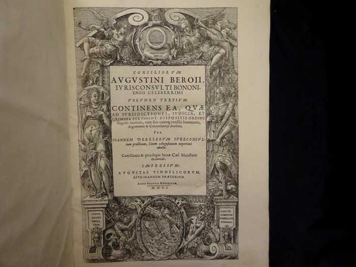 Consiliorum..per Ioannem Drezlerum..illustrata. Band 2 u. 3 (von 3). Augsburg, Praetorius 1601. Fol. 1 Bl., 827 S., 1 Bl., 647 S., 1 Bl. Mit gr. wdh. Holzschn.-Titelbordüren u. Holzschn.-Druckermarke. Prgtbde. d. Zt. mit bischöfl. Supralibros. Außen stellenw. fleckig, Schließbänder fehlen, durchgeh. gebr. u. stockfl., tls. wasserrandig, vereinzelt Unterstreichungen im Text, Alter Besitzervermerk auf dem Tit. Vgl. Adams B 785 (Ausg. 1577). - Wohl die erste Ausgabe in Deutschland, im VD 16 keine Ausg. vor 1600.