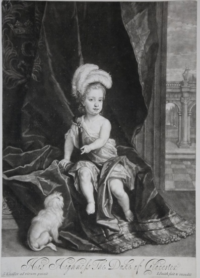 "His Highness, the Duke of Glocester". Portrait. Halbfigur en face. Mezzotinto von John Smith (ca.1652-1742) after Kneller, ca. 1694. Format (Platte): 33,8 x 24,4 cm (knapp beschnitten bis etwas in den Bildrand hinein). *William in the age of about 5 years. - Prince William, Duke of Gloucester (24 July 1689 ? 30 July 1700), was the son of Princess Anne (later Queen of England from 1702) and her husband, Prince George of Denmark. Gloucester's precarious health was a constant source of worry to his mother. His death in 1700 at the age of 11 precipitated a succession crisis as his mother was the only individual remaining in the Protestant line of succession established by the Bill of Rights 1689.