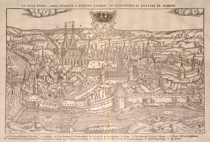 Eger. Belleforest, Francois. La ville d?Eger, jadis subjette à l?Empire Romain, et aujourd?huy au Royaume de Bohème. Paris 1575. Holzschnitt (nach Vorlage von Seb. Münster), 34 x 24 cm, breitrandig. Gut erhalten. "Schöne Gesamtansicht der ehemals freien Reichsstadt Eger aus der Vogelschau, im Vordergrund der Eger-Fluß; mit dem Stadtwappen sowie zahlreichen Gebäudeerklärungen. Dieser Holzschnitt ist eine zeitgenössische Kopie nach dem Blatt aus Sebastian Münsters Cosmographie, die Belleforest für seine in Paris 1575 erschienene Weltbeschreibung nachgeschnitten hatte. Da dieses Werk lediglich eine Auflage erlebte, sind Holzschnitte daraus selten und - wie auch unser Exemplar - stets außerordentlich scharf im Abdruck.".